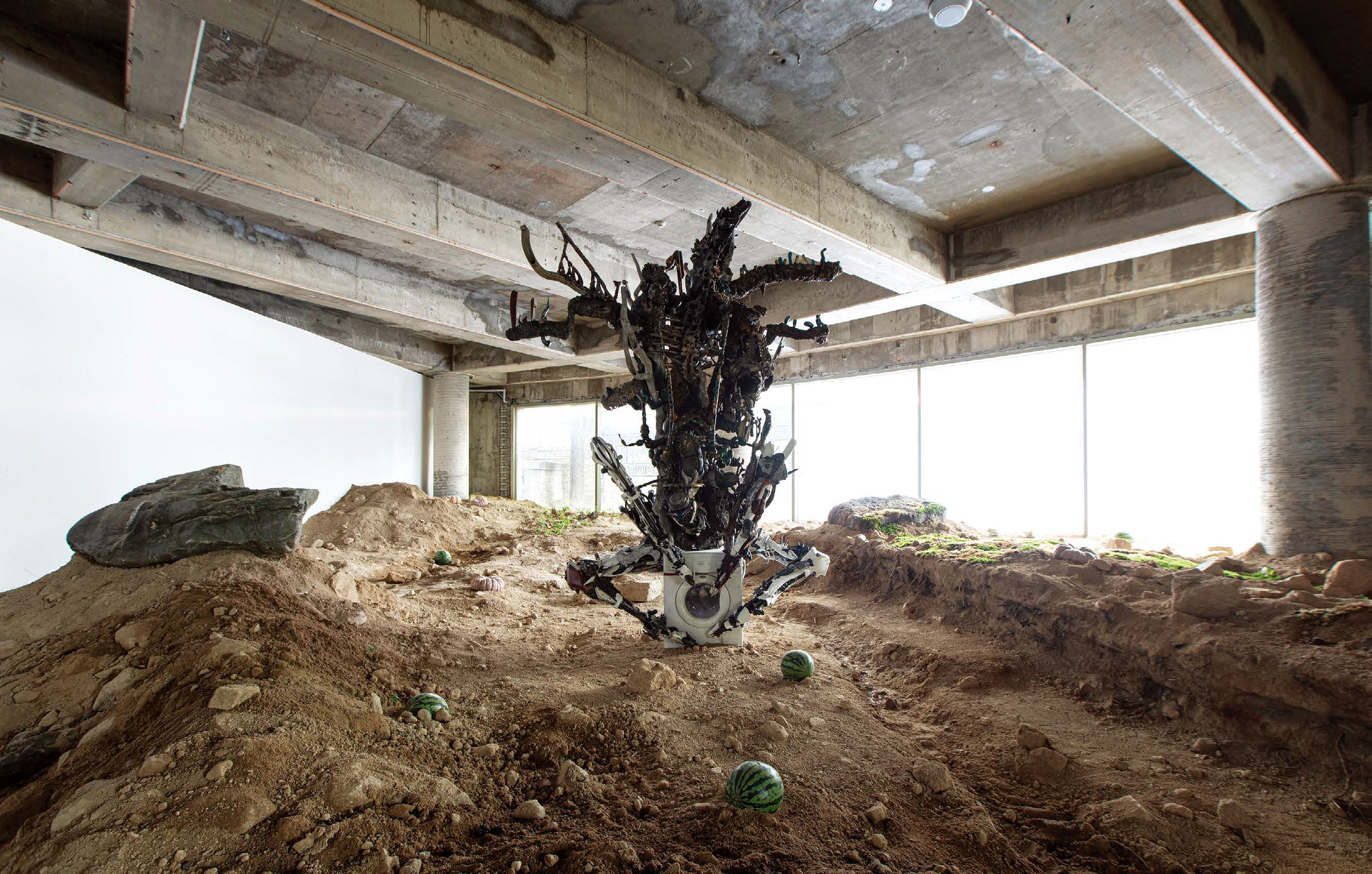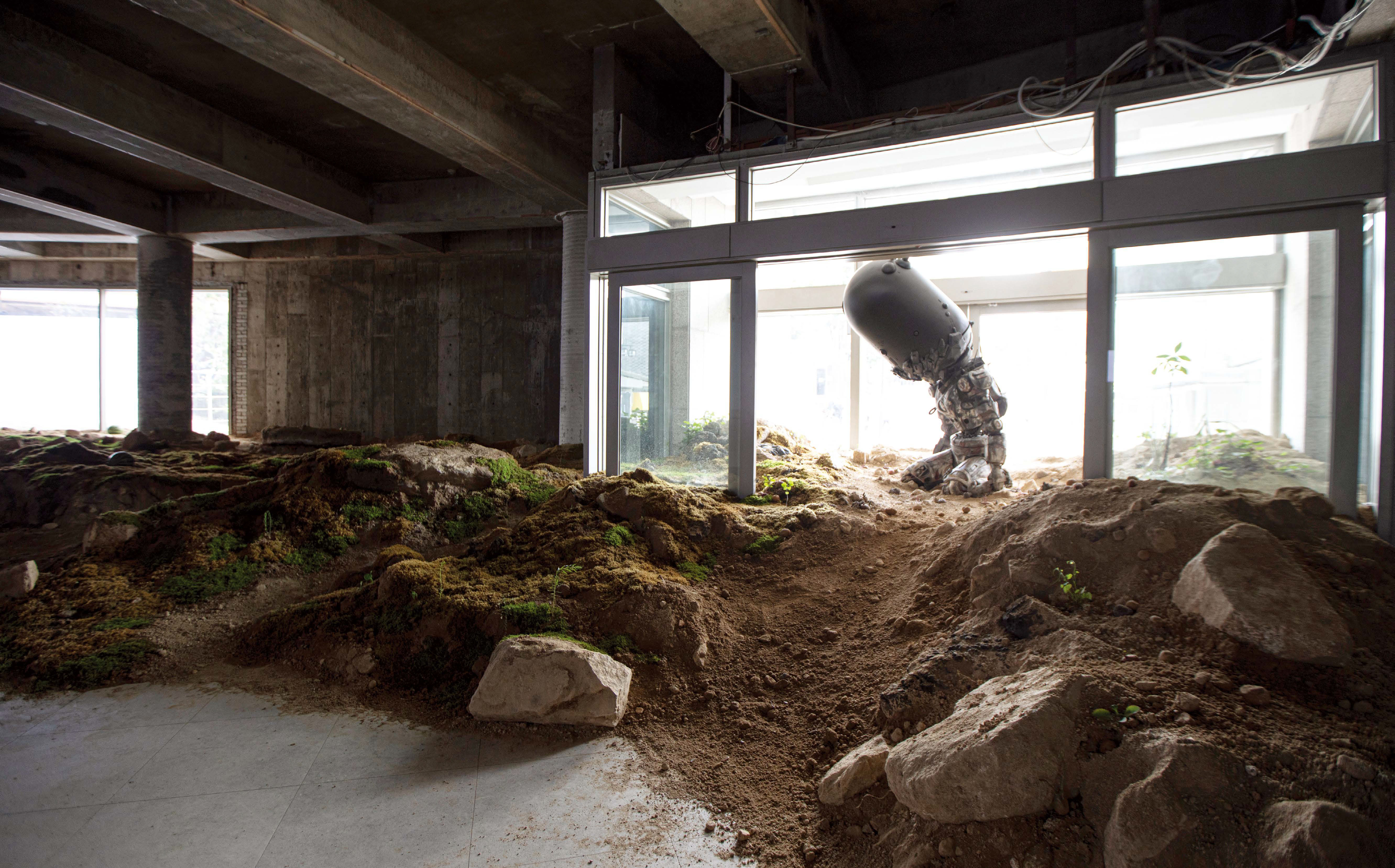 지하에서 1층으로 올라오면 관객은 익숙했던 아트선재센터의 로비가 아닌 낯선 풍경과 마주한다. 흙더미로 봉쇄된 유리문은 미술관의 정상적인 출입을 차단하고, 그 앞에는 외계 생명체를 연상시키는 철제 조각이 서 있다. 주변에는 양파를 비롯한 식물들이 자라고 있으며, 내부에는 세탁기를 품은 조각이 무인 상태로 작동한다. 창밖에서는 흰색 전광판의 빛이 내부로 쏟아져 들어온다. 이 백색의 침투는 화이트 큐브의 중립성을 전복한다. 미술관 내부의 ‘순수한 백색’이 아니라, 상업적 정보와 과잉의 외부 빛이 내부를 점령하며, 미술관이 차단해 왔던 현실의 소음을 강제로 유입시킨다. 세탁기를 품은 조각은 반복 노동과 일상의 기계적 리듬을 상징하면서, 인간의 부재 속에서도 멈추지 않는 시스템을 드러낸다. 여기서 기계는 더 이상 인간을 보조하는 도구가 아니라, 인간 이후에도 지속되는 조건이다. 1층은 폐허 이후의 낭만적 상상이 아니라, 인간 중심 서사가 이미 붕괴된 상태를 건조하게 제시한다.