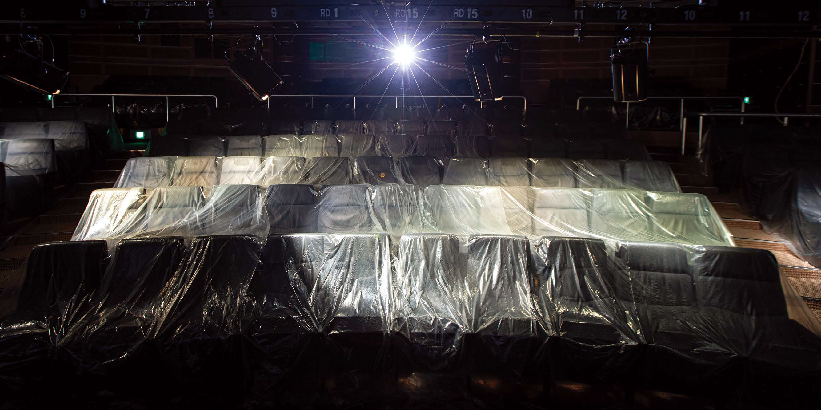 《적군의 언어》는 관객을 지하 강당으로 안내하며 시작한다. 이 선택은 전시적 효과를 노린 장치라기보다, 전시의 태도를 명확히 드러내는 선언에 가깝다. 행사 때가 아니면 거의 사용되지 않던 극장, 비닐로 덮인 좌석, 긁어내다 만 이전 전시의 벽글 흔적, 그리고 곳곳에 남아 있는 녹색 비상등. 이 공간은 인류 멸망 이후를 상상한 미래의 폐허라기보다, 이미아트선재센터 내부에 존재해 왔던 시간의 상태다. 기능은 남아 있지만 의미에서 밀려난 장소, 제도가 스스로 방치한 기억의 층위가 전시의 출발점이 된다. 비닐로 덮인 극장 의자들은 단순한 폐허적 장치가 아니라, 근대 이후 집단적 감각과 서사를 생산해 온 시네마의 장례처럼 보인다. 동일한 방향을 바라보며 동일한 이야기를 소비하던 이 공간은, 더 이상 작동하지 않는 문명의 서사를 얇은 막 아래에 봉인한 채 남아 있다. 녹색 비상등은 생존과 탈출의 신호이지만, 이곳에서는 오히려 위기가 일상화된 문명을 상기시키는 잔광으로 작동한다.