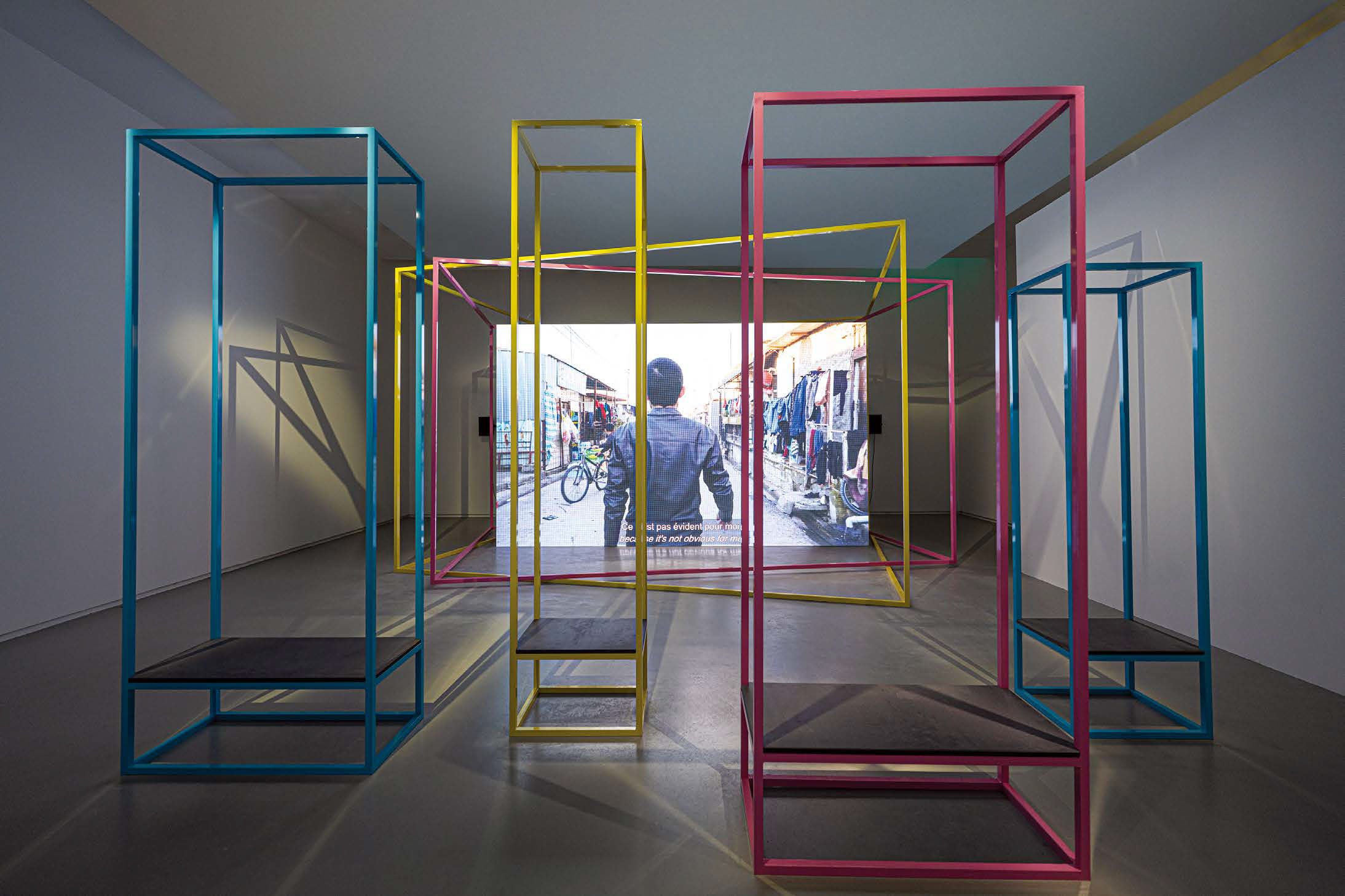 섹션 3부터 섹션 6까지의 전시실에서는 ‘분석적 AI’와 연결되는 얼굴 인식 시스템, 기계 시각, 탐지와 인식, 분류, 미세 노동 등의 세부 주제를 다룬다. 명확한 법적 기준 없이 생성된 얼굴 인식 이미지 데이터셋이 제기하는 윤리적 문제와 사생활 침해를 다룬 아담 하비(Adam Harvey)의 연구 프로젝트 〈Exposing.ai〉(2021~), 동시대 시각문화 안에서 기계 시각 시스템이 초래한 엄청난 변화를 분석하고 보여주는 트레버 파글렌(Trevor Paglen)의 영상 설치 〈Behold These Glorious Times!〉(2017) 등의 작품을 소개하고 있다. 그중 하이라이트는 이번 전시에서 처음 공개되는 슈타이얼의 신작 〈미캐니컬 쿠르드 족(Mechanical Kurds)〉이다. 제목은 18세기 자동 체스 기계로 알려진 (그러나 실제로는 인간이 조작했던) ‘미캐니컬 터크’와 미세 노동을 중개하는 온라인 플랫폼인 아마존 미캐니컬 터크(Amazon Mechanical Turk)를 동시에 반영하고 있다. 컴퓨터가 이미지를 식별할 때 나오는 사각형의 “바운딩 박스(bounding box)”를 연상시키는 색색의 사각 프레임 설치물들과 함께 13분 길이의 영상이 상영되는데, 쿠르디스탄 난민 캠프에서 데이터셋에 라벨을 붙이고 태깅하는 ‘클릭 노동자(click worker)’들의 모습을 들여다본다. 영상 속 노동자들은 디지털 이미지에 나타나는 사물을 색을 입힌 바운딩 박스로 표시하고 색인화(indexing)함으로써 드론 같은 무인기의 학습에 기여한다. 그러나 이는 동시에 그 바운딩 박스 속에 앉아 작품을 관람하는 우리 모두가 자동 인식과 분석의 대상임을 깨닫게 만든다. 슈타이얼의 이 작품은 AI 기술이 특히 중동의 분쟁 지역에서 어떻게 착취될 수 있는지를 조명하며, 아마존 미캐니컬 터크에 고용된 이들의 노동 조건에 대한 인식을 환기시킨다.