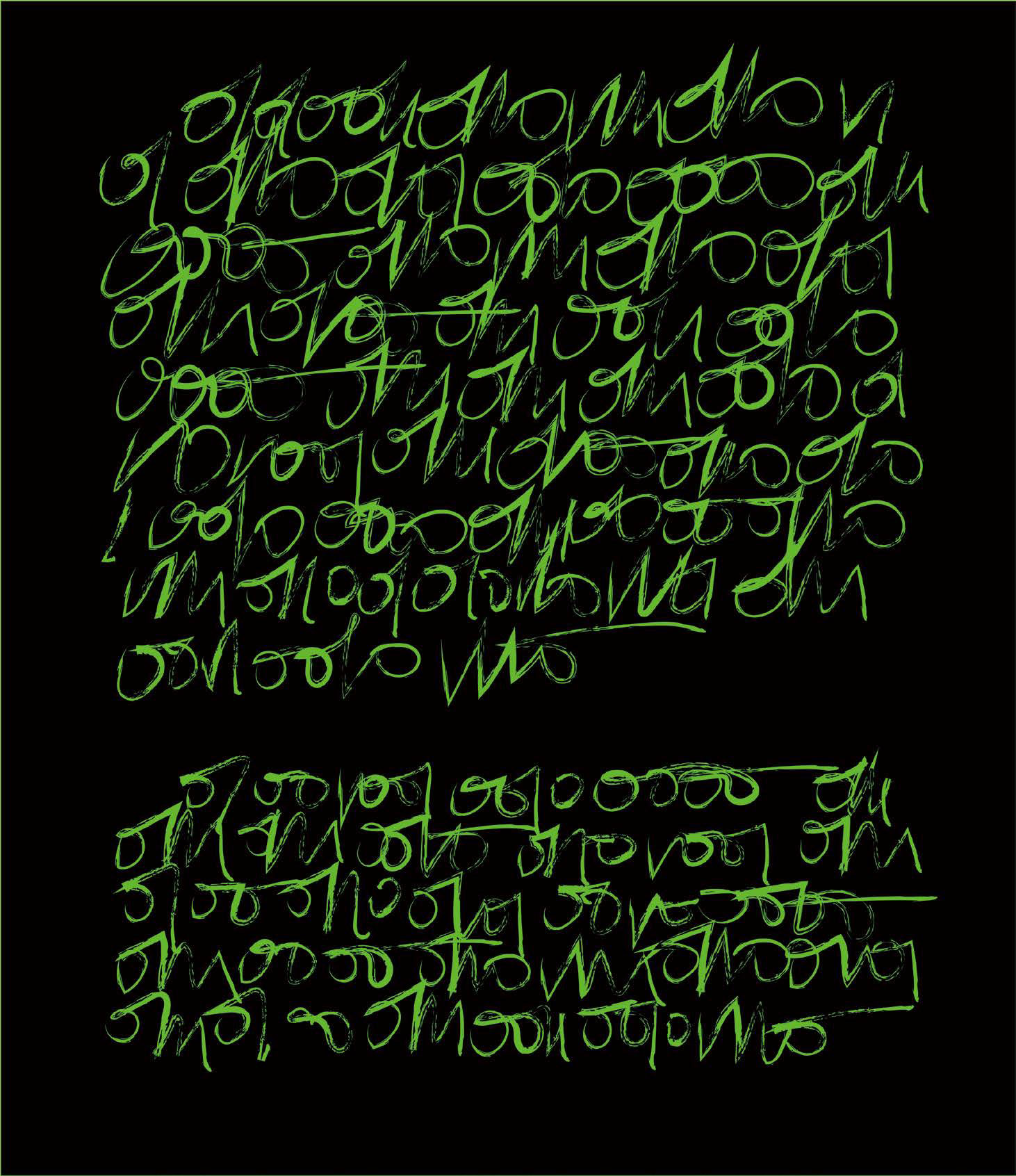 사샤 스타일스 〈Ars Autopoetica〉 디지털 프린트 5점 2023 작가가 개발한 GPT-3 다빈치 버전을 기반으로 한 언어 모델 Technelegy와 공동으로 쓴 시를 작가가 발명한 커시브 바이너리(Cursive Binary) 알파벳을 차용하여 아트매트르(Artmatr) 로봇이 서예 기법을 활용해 작성했다