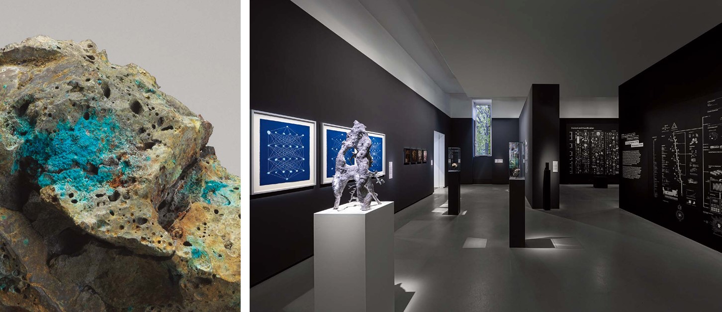전시의 도입부는 신선한 전환점을 제시한다. 인공지능을 ‘탈물질화’로 결부시키는 우리의 치명적 착각을 먼저 깨뜨리며, 사실은 막대한 양의 에너지와 물을 필요로 하는 데이터센터를 기반으로 한다는 점, 현재의 시점에서 AI는 비재생 에너지와 물, 석유와 석탄 같은 자원을 기반으로 한 추출 산업에 의존하고 있음을 먼저 명확히 드러낸다. 첫 전시장에 들어서면, 마치 자연사 박물관의 광물학 갤러리에 들어선 것 같은 느낌을 받게 된다. AI를 주제로 다룬 전시에 디지털 이미지나 영상을 상상하며 입장한 관객의 기대를 전복시키며, 기술이 본질적으로 물질적이라는 사실을 환기한다. 암석 같은 자연물을 사용해 AI의 영향력을 탐구하는 줄리앙 샤리에르(Julian Charrière)의 작품 등이 그 분위기를 형성하며, 조각의 3차원성을 통해 물질성이 강조된다.