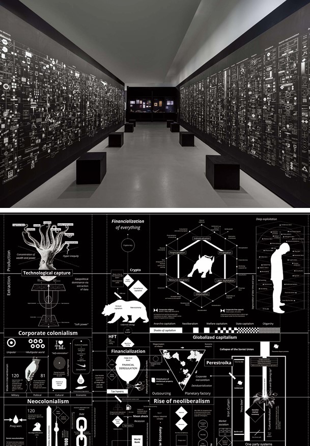 이어지는 두 번째 섹션에서는 국내에서도 널리 알려진, 케이트 크로퍼드(Kate Crawford)와 블라단 욜러(Vladan Joler)의 대형 다이어그램 두 점, 〈AI 시스템의 해부학(Anatomy of an AI System)〉(2018)과 〈계산하는 제국들(Calculating Empires)〉(2023)을 공간에 벽화처럼 설치하여, 물리적 시공간 속에서 시각화된 AI를 떠받치는 물질의 민낯을 찬찬히 들여다볼 수 있게 했다.〈AI 시스템의 해부학〉은 “오늘 날씨 어때?”와 같은 단순한 질문에 응답하는 음성 지원 AI 시스템 뒤에 존재하는 방대한 행성적 네트워크를 시각화하며 물질 자원, 인간 노동, 데이터가 어떻게 추출되고 착취되는지 그 과정을 드러낸다. 한편, 〈계산하는 제국들〉은 문화적·경제적 네트워크가 형성되기 시작한 시점인 1500년대부터 오늘날 이 전시가 열리고 있는 2025년 시점의 AI시대에 이르기까지 기술과 권력의 얽히고설킨 계보를 한눈에 보여주는 인포그래픽 작품으로, 500년 이상의 기술·권력 계보를 시각화하며, 미래의 향방을 가늠하게 한다.