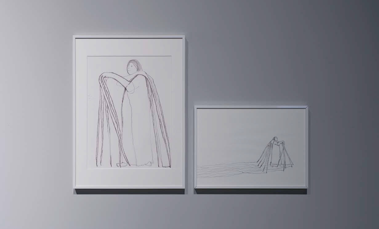 전시장에 입장한 관객을 처음으로 맞이하는 작업은 〈PARA〉(2024 )에 대한 기록으로, 제목이 시사하듯 기록 영상에 가깝다.〈PARA〉는 2024년 11월 하상현이 큐레이팅한 인상적인 그룹전《Masochistic Screen》에서 곽소진이 선보인 퍼포먼스 작업인데, 단단하게 접힌 낙하산 천을 부풀렸다 다시 접는 두 명의 퍼포머와 무전기를 들고 지나가는 한 명의 퍼포머가 등장한다. 30분 길이의 실제 퍼포먼스를 20분 정도로 편집한 영상임에도 이 작업은 표면적으로 이러한 요약을 거의 벗어나지 않아 보이기 때문에 관객 대부분은 다음 작업으로 곧장 넘어가곤 했다. 물론 그렇게 넘어간다고 뭔가 선명해지는 건 아니다. 비슷한 눈높이에 걸린 다섯 개의 작은 프레임들은 두 개의 연작을 이루는데, 하나는 번개가, 다른 하나는 손톱이 중심에 놓인 드로잉들이다. ‘낙하산과 번개, 손톱이 대체 무슨 상관이란 말인가?’