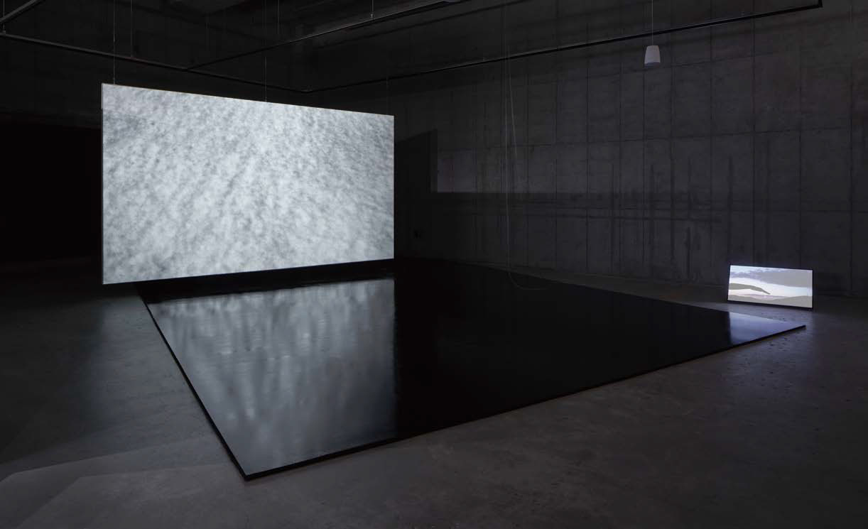 이렇게 한없이 중첩되는 역설은 태양이라는, 지구상의 모든 대상을 (안) 보이게 하는 가시성의 원점을 오히려 네거티브로 변환해 흑점이자 맹점에 가깝게 만들어버리는〈체이싱〉(2021)주위를 맴돈다. 서울에서 서해안까지 이어진 여정 속에서 자동차 안의 흔들리는 카메라로 태양을 끈질기게 담은 이 작업은 매우 뜬금없어 보이지만, 한때 유행했던 ‘태양을 피하는 법’이라는 대중가요를 사실상 물구나무 세운 것이기도 하다. 죽음과 삶의 경계처럼 쉽게 볼 수 없는 것을 가시화하려면, 기존의 가시성의 조건 자체를 근본적으로 비활성화해야 한다는 의미에서 말이다. 이 작업이 웬만한 키의 남성 관객들도 올려다봐야 하는 모니터에서 상영됐지만, 동시에 〈검은 새 검은 색, 30분〉(2021)이라는 거대한 사진 이미지의 일부로 설치되었다는 점 역시 우연은 아니다. 새로 재정위된 가시성의 조건이 맹점처럼 보일 뿐 아니라, 그 맹점 자체가 거대한 맹점의 바다처럼 보이는 떼까마귀의 궤적과 겹쳐진다는 것. 어쩌면 이것이야말로 “까마귀를 보려면 검은색을 통과해야 하고, 검은색을 보려면 검은색을 의심해야 한다”는 작가의 수수께끼 같은 전언의 의미가 아닐까?