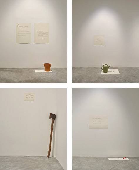 〈하나의 가정〉화분, 물뿌리개, 도끼, 모종삽, 종이에 연필 가변 크기 1995