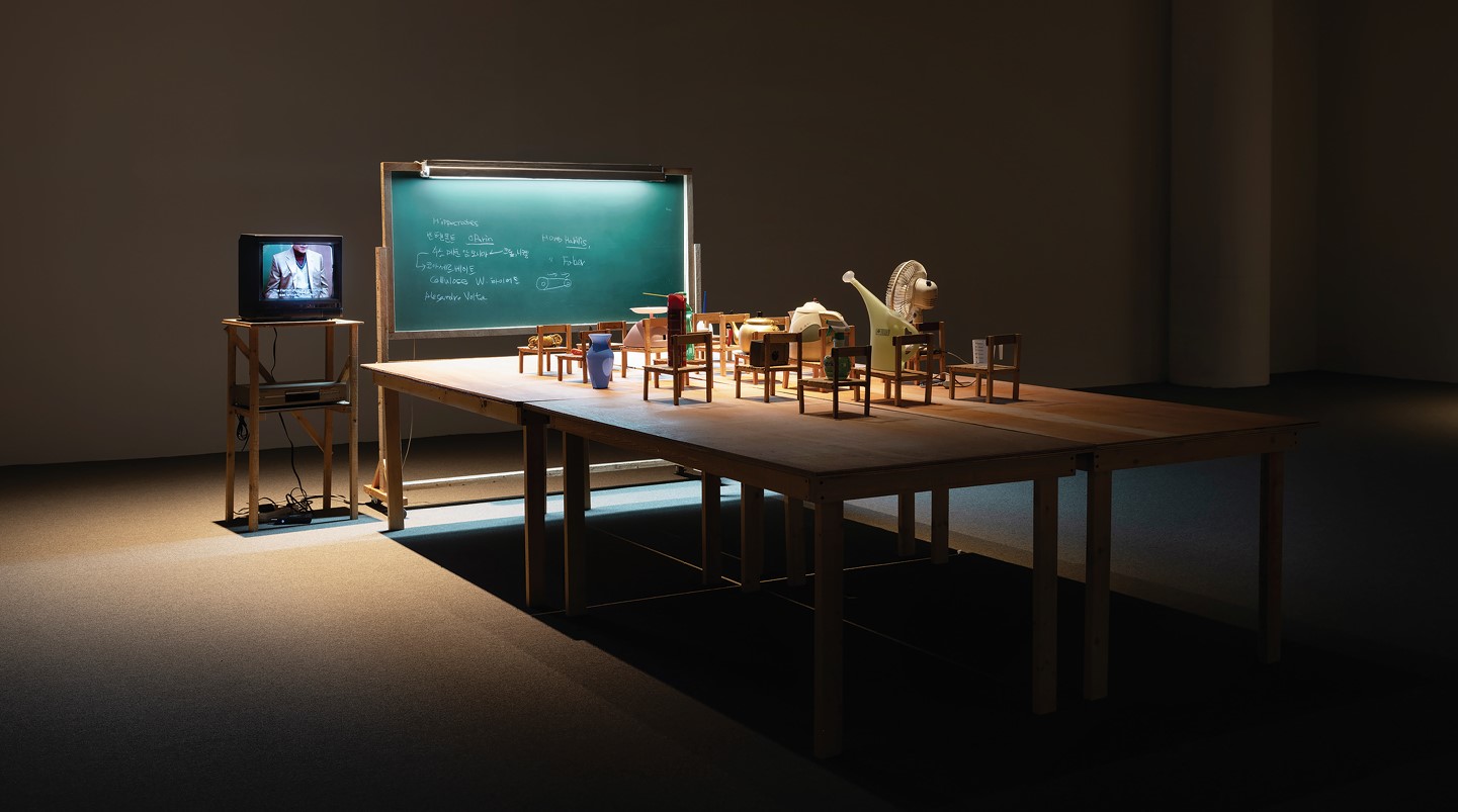 〈자신이 도구에 불과하다고 배우는 사물들〉 일상적 사물들, 목재 의자, 목재 탁자,