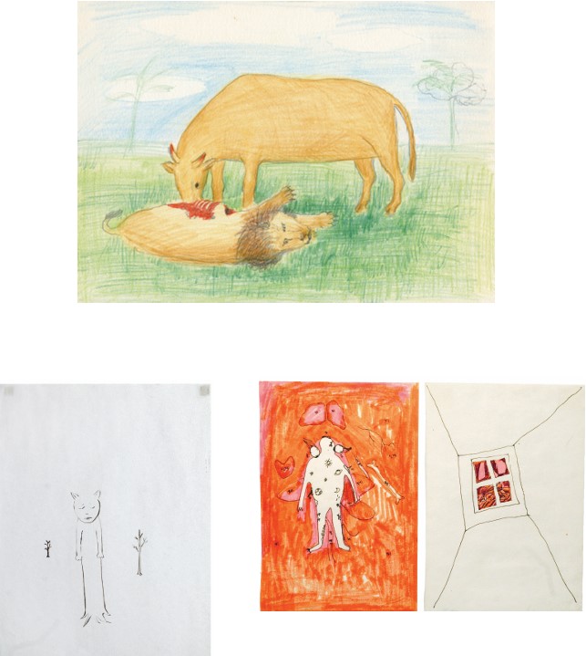 - 같이보기〈서 있는 개 #2〉(1991, P. 68),〈개 먹이 개〉(1993, P. 79),〈두려움 없는 두려움〉,〈무제〉(1991),『눈치』(2009)