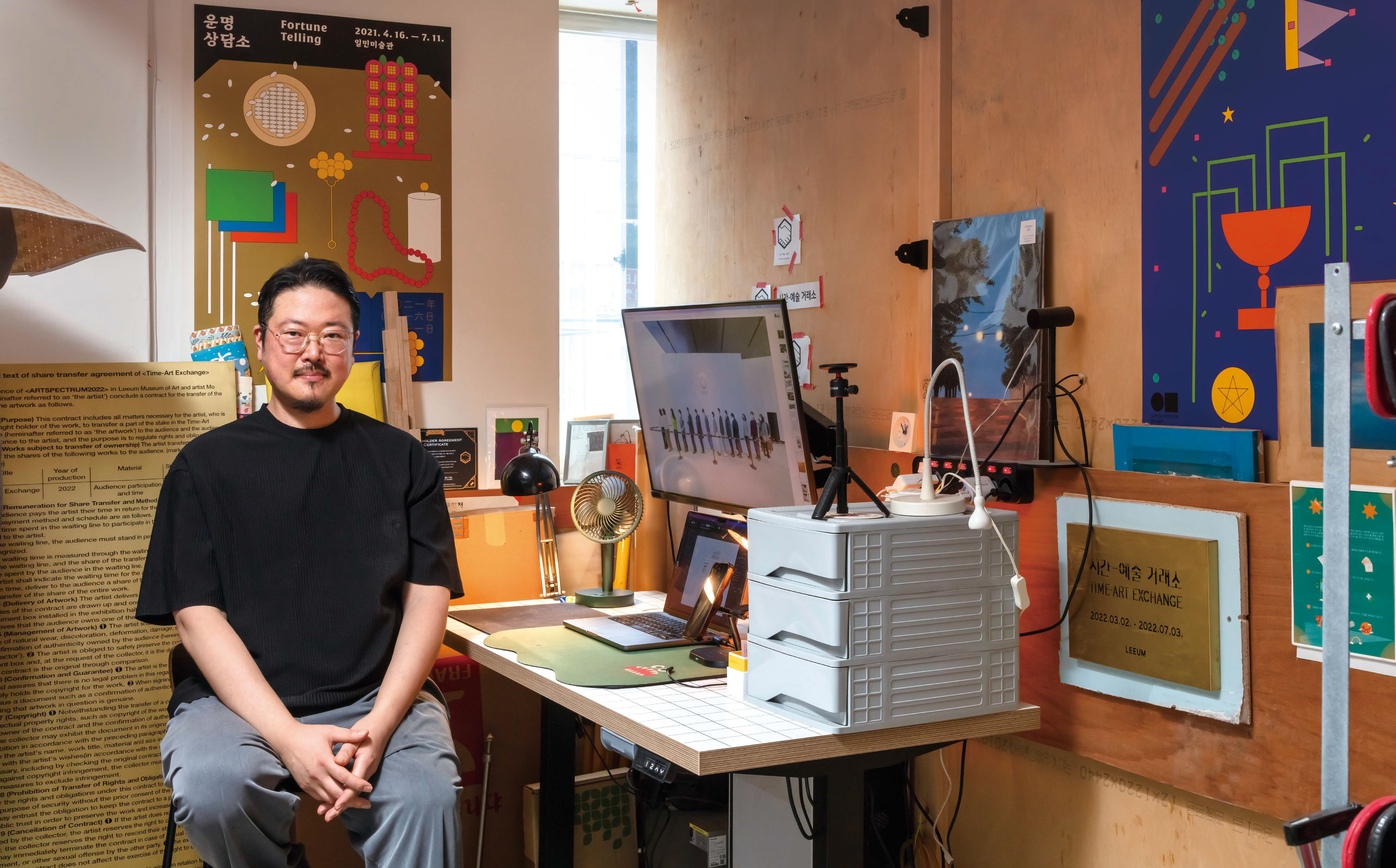 2022년 리움미술관 《아트스펙트럼》 전시장 한가운데에는 단 한 사람씩만 입장할 수 있는 밀폐된 공간이 설치되었다. 증권사의 VIP룸을 연상시키는 그 공간은 김정모의 〈시간 예술 거래소〉였다. 입장을 위해 관객들은 길게 줄을 서야 했고, 대기한 시간만큼 계약서에 ‘지분’이 기록되었다. 엄중한 분위기 속에서 관객은 작가가 제시한 안내문에 따라 작품 지분에 관한 양도 계약서에 서명하고 증명서를 교환하는 의례를 수행했다. 그러나 이 거래에서 화폐는 존재하지 않았다. 김정모는 교환 단위를 오직 ‘시간’으로 제시했다. 계약서는 거래의 형식을 흉내 낸 문서에 불과했고, 작품의 실체는 그 종이 위에 남아 있지 않았다. 작품은 이미 사라져버린 기다림의 시간, 그리고 그 시간 속에서 형성된 경험과 감각 속에만 자리했다. 자본의 논리가 가격을 통해 작품을 규정한다면, 김정모는 시간을 소비하는 행위를 통해 시장의 언어가 지워버린 감각적, 사유적 층위를 되살린 것이다.