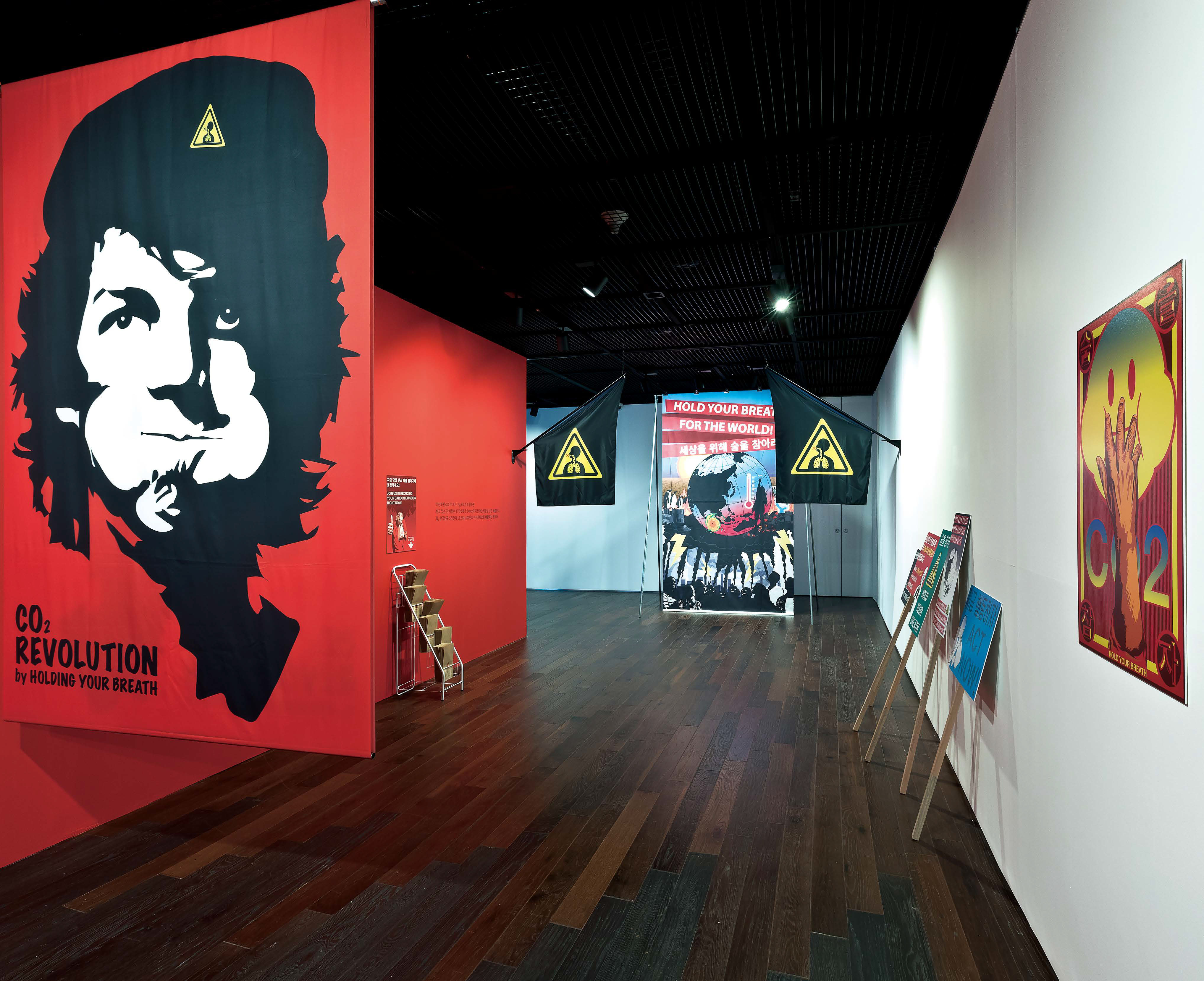 〈프로파간다 룸〉에서 그는 기후 위기라는 절박한 의제를 다루지만, 그 방식은 아이러니와 무용한 제스처로 가득하다. 관객은 ‘숨을 참아 탄소 배출을 줄이자’는 구호와 마주한다. 과학적으로 아무 효과가 없다는 사실은 은폐되지 않는다. 오히려 바로 그 무의미함을 통해 기후 담론의 공허를 드러내고, 동시에 관객이 함께 무용한 행동을 수행하도록 요청한다. 숨을 참는 행위는 쓸모없지만, 그 무용함 속에서 관객들은 하나의 공동체적 감응을 경험한다. 이 역시 바타유가 말한 ‘낭비’의 개념과 맞닿아 있다. 효율적이지 않음에도 소진과 손실을 통해 의미가 발생하는 것이다. 그러한 의미 있는 소진의 의례적 형식이라는 점에서, 김정모의 작업은 쓸모없음의 반복 속에서 예술이 어떻게 또 다른 힘을 획득하는지를 보여준다.