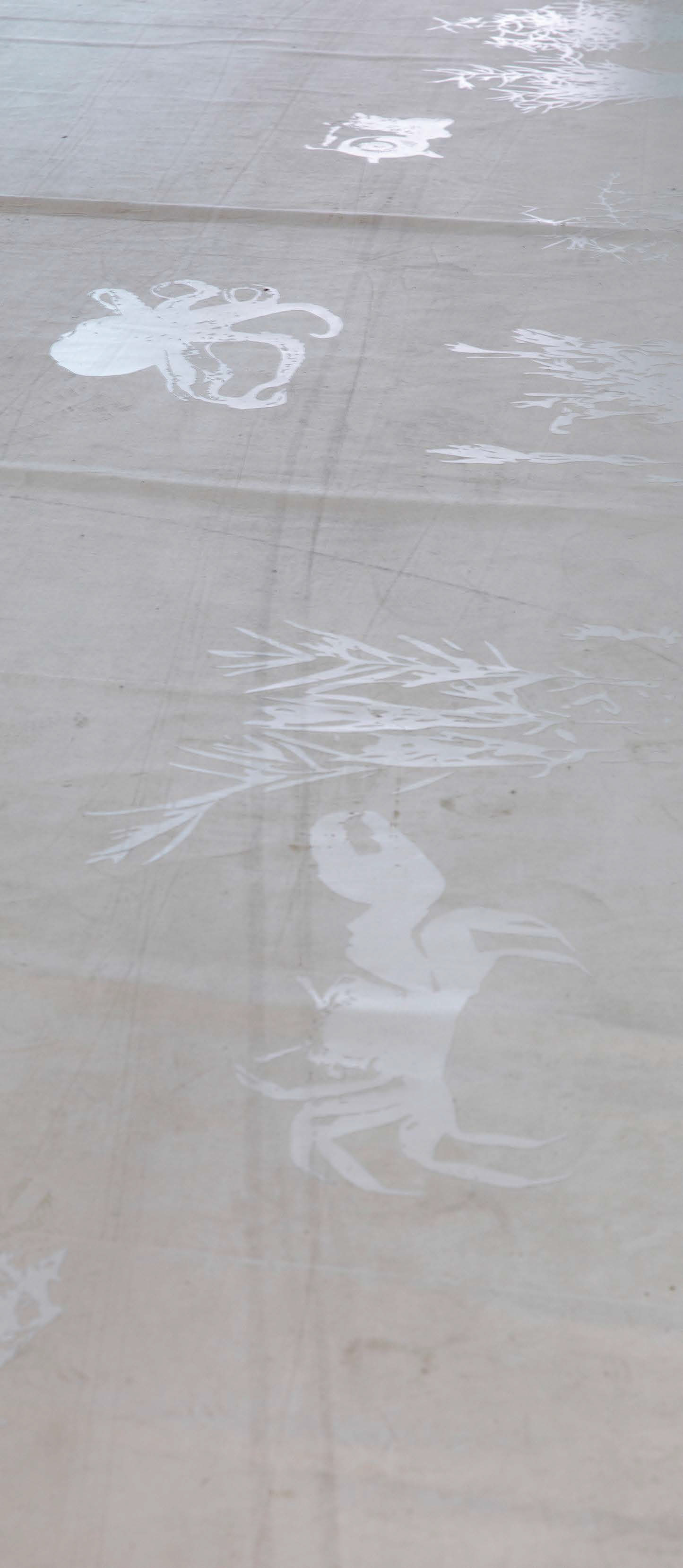 올 상반기 아르코미술관에서 선보인 〈당신의 발 밑에서〉(2025)는 이러한 비생산성과 감응의 미학을 도시 생태의 맥락으로 옮겨놓았다. 전시장에 들어선 관객은 무심코 흰 캔버스를 밟고, 캔버스 천 위에 이들의 발자국이 쌓이면서 점차 서울의 보호 야생생물 55종의 형상이 드러났다. 작가는 창덕궁, 청계산, 한강, 남산 등지에 서식해 온 동식물을 조사해 드로잉으로 옮기고 그것을 시트로 제작해 캔버스에 부착했다. 도시화와 개발로 서식지를 잃고 멸종 위기에 처한 생명들은 관객의 무심한 참여를 통해 비로소 가시화된다. 여기서 참여란 단순히 관객의 체험을 의미하지 않는다. 참여는 곧 작품을 이루는 필수적인 과정이며, 그 과정 속에서 관객과 비인간 존재들은 서로의 존재를 감응하게 된다. 발자국은 의도되지 않은 흔적에 불과하지만, 그것이 모여 사라져가는 생명들의 형상을 되살리는 순간, 관객은 자신도 모르게 비인간 존재들과 감응하는 관계의 장에 들어선다. 이 작업은 인천 간척 사업 이전 갯벌의 멸종 위기 생물들을 조사했던 그의 프로젝트의 연장선에 있으며, 개발로 인해 사라진 생명들을 기록하거나 복원하기보다 무심한 인간의 발걸음을 통해 다시 드러내는 아이러니를 연출한다.