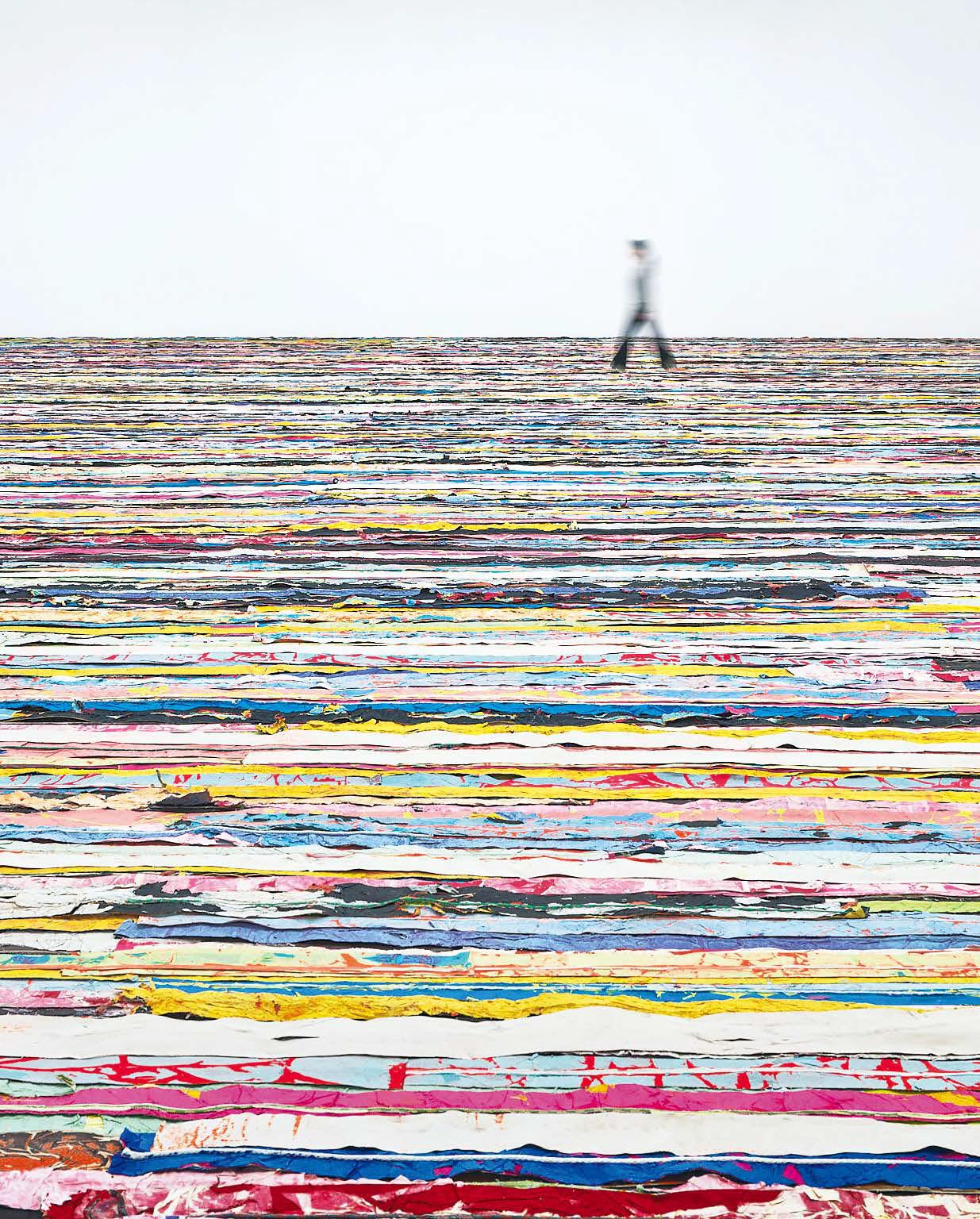 전시 공간에서 처음 관람객을 맞이하는 작품은〈떠오르다(Float)〉(2019)이다. 약 180평 남짓한 공간의 바닥을 가득 덮은 대형 작품을 맞닥뜨리는 순간 벽화처럼 거대한 색띠의 추상회화를 마주한 것 같다. 바닥에 발을 들이는 시점부터는 거리를 두고 관람하는 모더니즘식의 추상이 아닌 시각예술로 번안된 도시 공간을 경험하는 설치미술로 전환된다. 광활한 색면 평원은 도시의 흩어진 잔해로 가득하다. 브래드포드는 작업실 주변 거리에서 광고 포스터, 전단지, 현수막, 신문지를 수집했다. 작가는 도시의 부산물을 자르고 노끈으로 이어 붙인 수많은 알록달록한 긴 띠로 전시장 바닥 전체를 덮었다. 그 사이사이에는 색 노끈과 스트랩이 삽입되어 있다. 색띠로 직조된 표면을 걷는 행위는 그리 매끄럽지 않다. 바니시로 마감된 반짝거리는 표면이 아니라 빳빳하고 거친 천이 겹치면서 미세한 틈과 단차가 생겨 지면이 고르지 않다. 이곳은 어떤 장소를 지시하거나 규정하지 않는다. 걷는 동선이 수평인지 수직인지 모호할 뿐 아니라 방향 상실의 감각이 느껴진다. 거칠고 성긴 도시의 파편으로 만들어진 공간은 걷는 이에게 질문한다. 이 도시의 흔적 아래에는 어떤 시간의 층위가 겹쳐 있는지, 그 층 사이에 만들어진 틈에는 어떤 기억이 끼어 있을지, 우리는 무엇을 그리고 누구를 무심코 밟고 있는 것은 아닌지. 〈떠오르다〉는 단순히 캔버스 위를 걷는 행위에서 그치는 것이 아니라 사유를 향한 그의 여정에 참여하는 이정표를 만든다.
