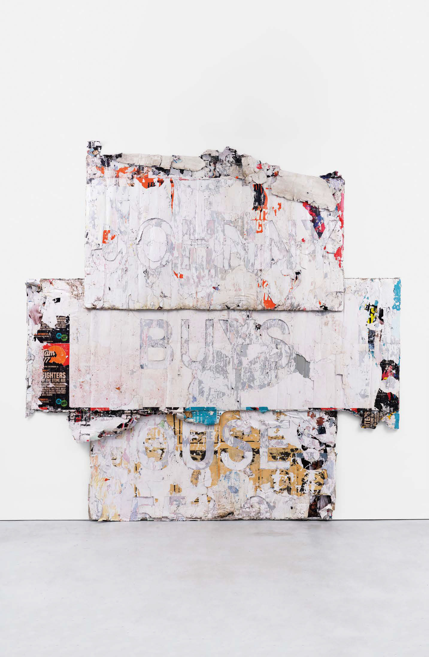 도시의 파편을 활용하는 것은 브래드포드의 작품 대부분을 관통하는 방식이다. ‘상업 포스터’ 연작은 로스앤젤레스에서 매일같이 수없이 생산되고 버려지는 부산물을 적극적으로 활용한 작품이다. 작가는 도시의 버스 정류소, 공터, 이발소에서 흔히 볼 수 있는 전단지를 수집했다. 전단지는 저렴한 보험, 이혼과 친권 소송, 신용불량자를 위한 대출, 신속한 이민 서류 처리를 광고한다. 브래드포드는 한 인터뷰에서 거리 포스터는 일종의 백색소음처럼 자신의 주변 환경을 구성한다고 언급했다. 전단지는 도시를 만드는 환경이자 지역 커뮤니티의 현실을 말하는 사회적인 언어인 셈이다. 작가는 수집한 전단지와 여러 겹의 빌보드지를 겹친 후 사포질하거나 긁고 뜯었다. 〈무제(상업 포스터)(Untitled (Merchant Posters)〉(2024 )에서 전체를 분명하게 읽을 수 있는 텍스트는 찾기 어렵다. 불에 타거나 물에 불었다가 마르면서 만들면서 흑인, 퀴어, 주변부로 밀린 삶까지 지리적, 역사적 표백된 것처럼 해독할 수 없는 상태로 벗겨져 있다. 혹은 여러 장의 포스터가 겹치면서 서로 다른 장의 단어가 뒤섞인다. 작품에는 주변에서 일어나는 고단하고 절박한 현실을 이야기하고 있는 것과 동시에 말할 수 없고 들을 수 없음이 공존한다. 구체적인 삶의 서사를 진술하기보다 매일같이 일어나는 사건의 연속에서도 무심하게 이어지는 삶의 상태를 이야기하는 것처럼. 전단지 위에 또 다른 전단지로 벽면이 도배되어 아무 일도 없었다는 듯 리셋되지만 그 아래에는 시간의 여러 층이 쌓이는 것처럼.