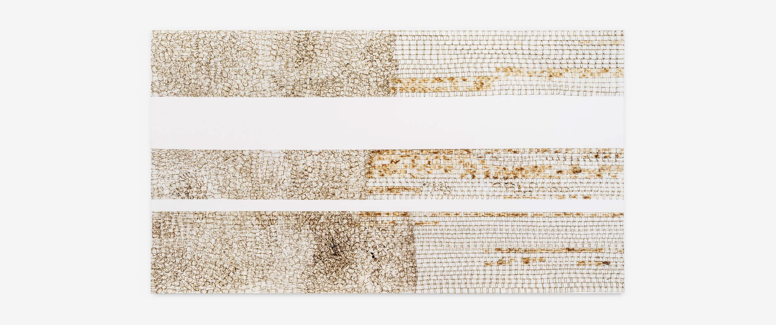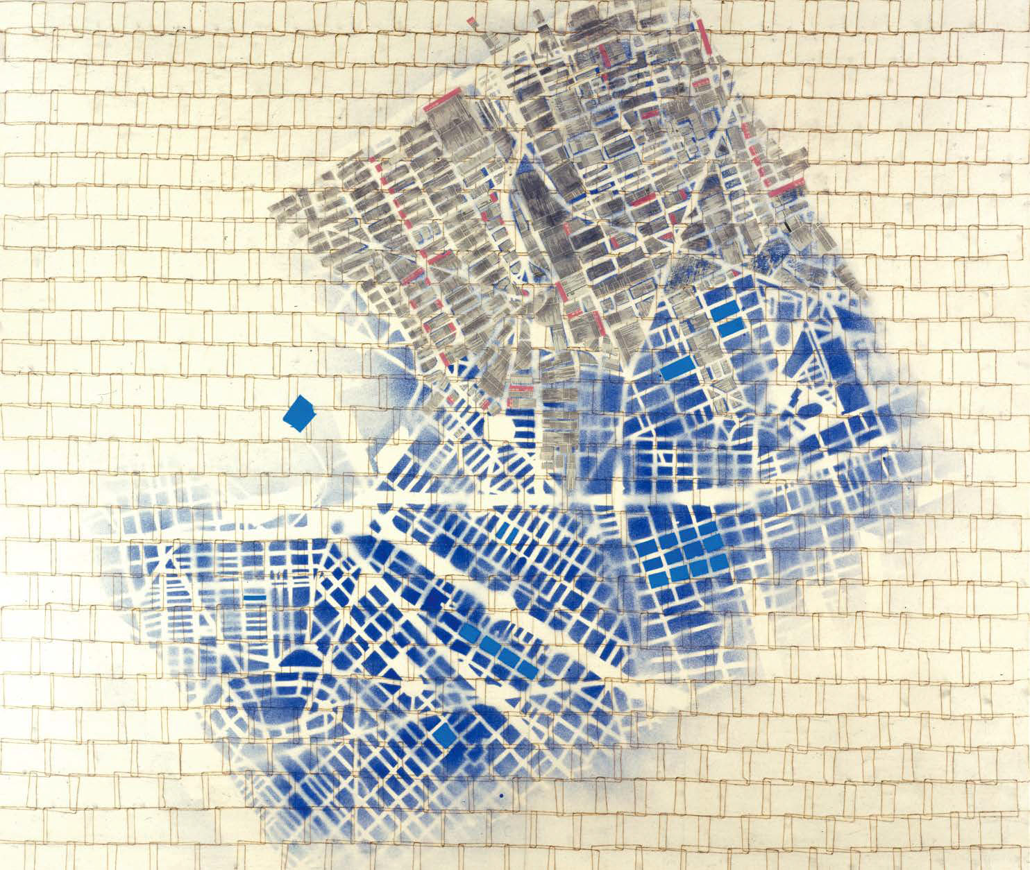 20여 년에 걸친 ‘엔드 페이퍼’ 연작은 2020년대 들어 더욱 투명하고 유기적인 방식으로 구현되었다. 최근작에 속하는 〈사랑도 증오도 아닌(Neither Love nor Hate)〉(2024 ), 〈심장이 뛰는 쪽(The Way Your Blood Beats)〉은 엔드 페이퍼를 사용해 정서적인 ‘지도’를 그린다. 브래드포드는 엔드 페이퍼의 가장자리를 토치로 그을려 반투명한 종이에 테두리를 만들었다. 이 투명하고 얇은 면은 여러 장을 겹쳐도 텍스처나 두께감이 없이 캔버스에 납작하게 붙는다. 촘촘하게 짜인 초기작의 격자 구조보다 최근작에서는 더욱 느슨하고 유연한 방식으로 엔드 페이퍼가 활용되었다. 여러 장이 꼬리에 꼬리를 물고 이어지고 겹치면서 만들어내는 선의 흐름은 공간에 리듬감을 부여한다. 현미경으로 본 세포의 꿈틀거리는 움직임이 떠오르는 이유이다. 지도 위에 영원히 박제되길 꺼리는 듯 정연함과 무질서, 수축과 완화, 작은 유닛과 덩어리, 침묵과 소란스러움을 오가며 시각적인 효과를 발생시킨다. 이러한 화면의 변화는 도시를 직접 다룬 작품이 아닐지라도 사람들과 커뮤니티로 인해 살아 움직이는 도시를 비유한다. 또한 도시를 오고 가는 이들의 이동 흔적을 (비)가시적으로 보여준다.