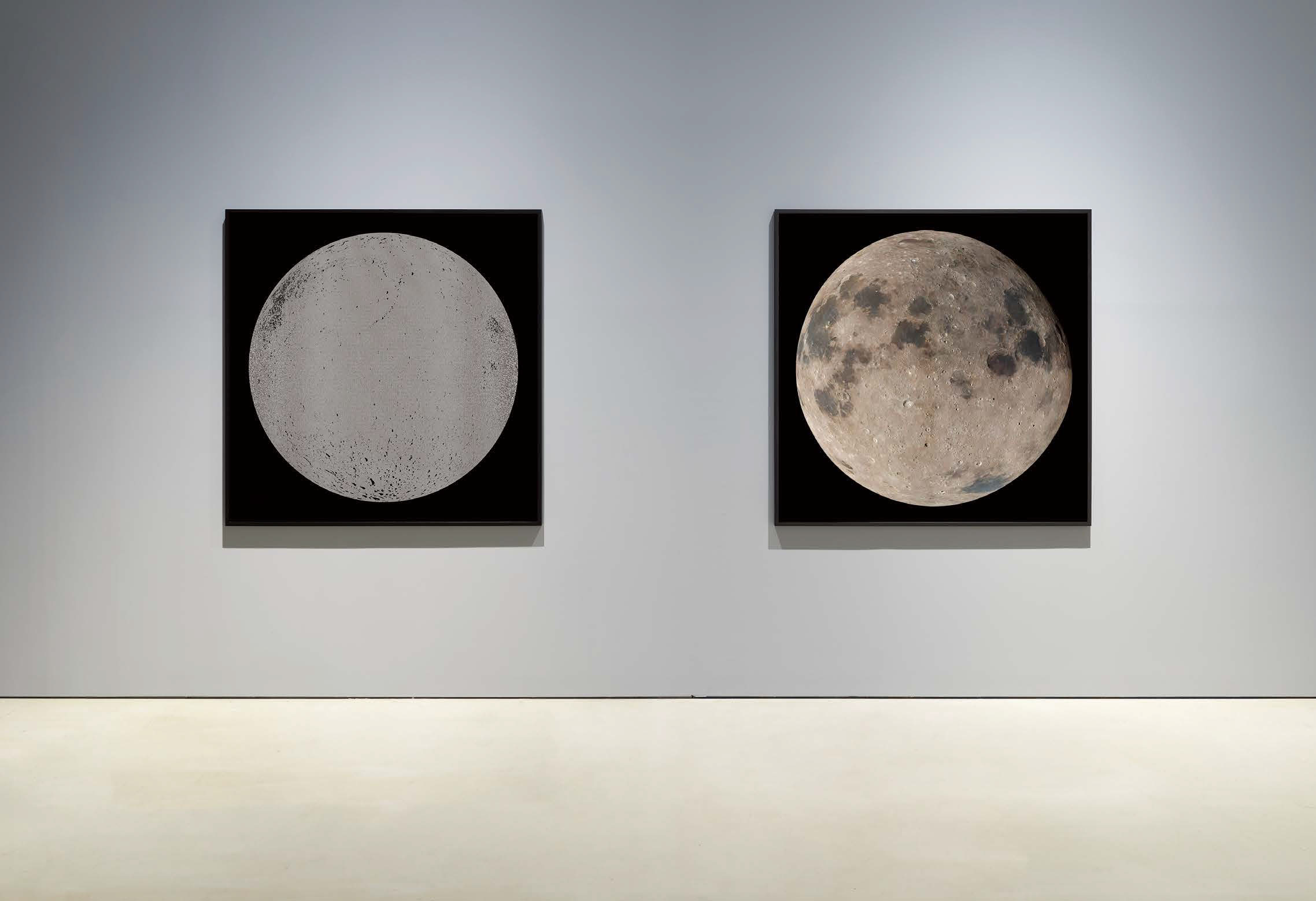 김현석 〈완벽함에 대한 무의미적 행위(달)〉(사진 왼쪽) 디지털 프린트 152×152cm 2015, 김현석 〈완벽의 기원〉(사진 오른쪽) 디지털 프린트 152×152cm 2023 사진: 임장활 제공: 울산시립미술관, 작가