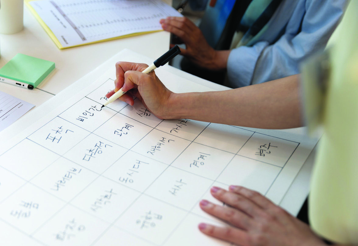 ‘낮과 밤의 글쓰기’ 오리엔테이션에서 예술 텍스트 속 빈출 단어로 빙고 게임을 하는 모습