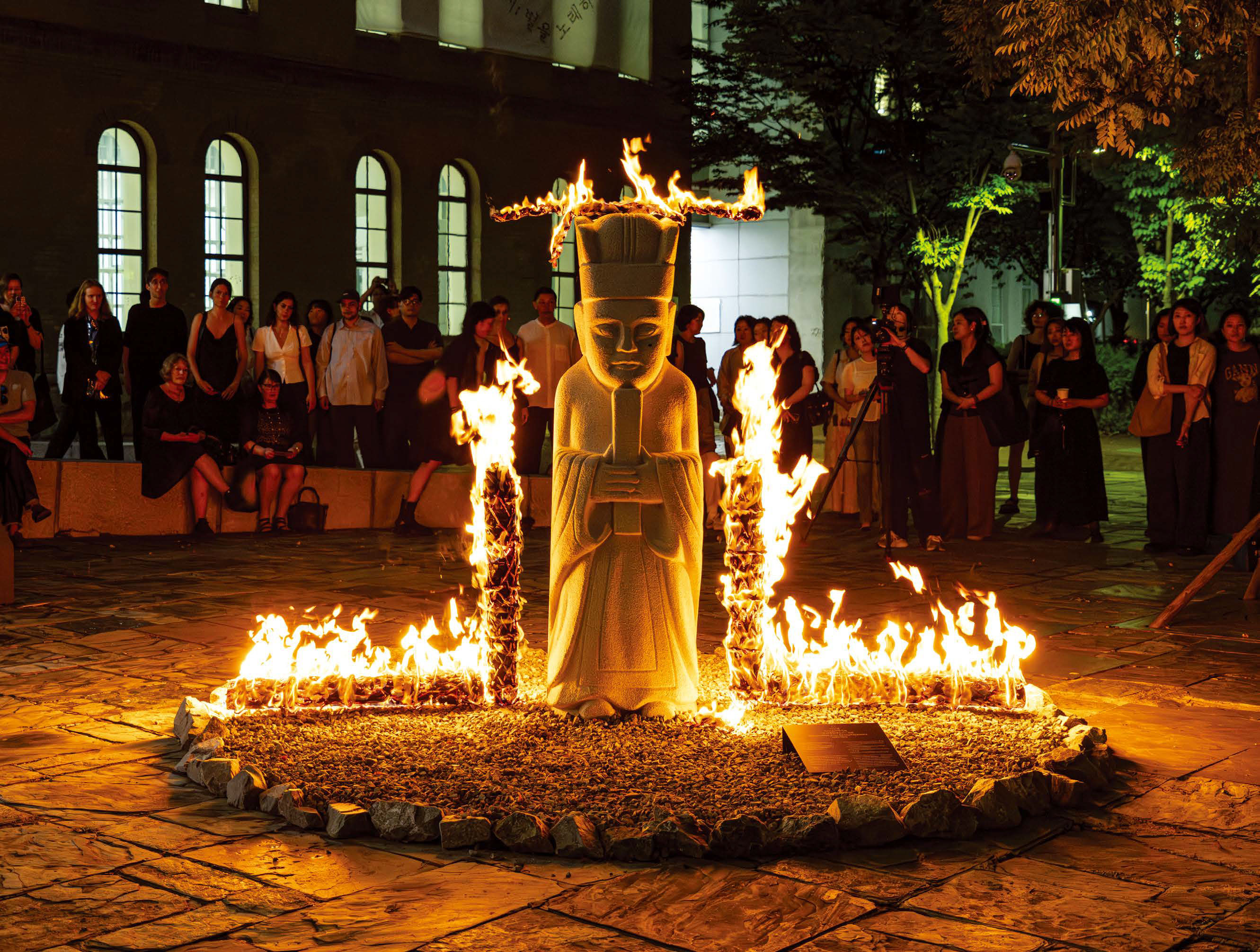 참여 작가 50여 명(팀)의 면면은 기획 의도를 웅변한다. 조지아나 하우튼, 힐마 아프 클린트, 엠마 쿤츠와 같은 작가는 미술사에서 외면된 영적 실천을 다시 소환하고, 요제프 보이스와 백남준, 이승택 등은 의례를 불러낸다. 이를테면 이승택의 〈분신행위예술전〉(1989/2025) 재연은 자신의 회화와 조각 작품에 불을 붙여 물질이 예술로 승화되는 연금술적 과정을 거꾸로 작동시키고, 히와 케이의 영상 〈하지 레이저라 불리는 사람〉(2025)은 서구 의학의 기업적 이익 논리와 선주민의 전통 의료를 교차하며 오늘날 우리의 정치·사회적 현실을 환기한다. 이러한 사례들은 전시가 의도한 계보를 풍성하게 증명함에도, 전시 전체의 흐름이 매끄럽게 이어지기보다는 학술적 조사와 개별 작품의 병렬적 집합으로 느껴지기도 한다.