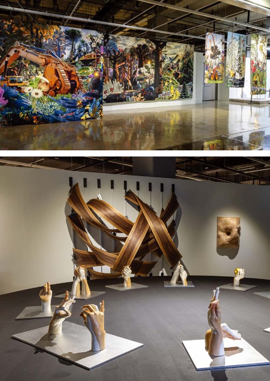 두 번째 섹션 ‘탐미주의자를 위한 공예’는 시각 이미지가 범람하는 시대에 공예만이 제공할 수 있는 경험, 곧 손의 감각과 노동의 축적, 재료의 저항을 직시하는 과정을 전면에 내세운다. 바로 그 지점에서 공예는 시·회화·건축에 못지않은 독립된 예술로서 설득력을 얻는다. 김희찬의 신작은 얇은 베니어판을 휘어 구리선으로 엮어낸 구조물로, 매끈한 완결을 거부하며 뒤편의 매듭과 결절을 통해 노동의 흔적을 적나라하게 드러낸다. 모나 오렌은 밀랍의 투광성과 취약성을 살려 연잎과 꽃잎을 극사실적으로 재현하며, 불안정성이 시적 아름다움으로 전환되는 순간을 보여준다. 숙련의 극치에 이른 작업들도 눈길을 끈다. 구세나는 13번의 소성과 채색을 거쳐 피부 질감을 구현한 도자 손으로 통각적 관찰의 끝을 증명한다. 그러나 이 섹션은 완벽한 숙련만을 탐미의 조건으로 제시하지 않는다. 구로다 유키코는 상실의 경험 속에서 깨진 그릇을 수리하며 치유의 미학을 실천하고, 최기룡은 유리 속 기포를 금박으로 메워 결함을 장식으로 전환한다. 실패와 불완전함이 극치의 미학으로 도약하는 순간을 보여준다.