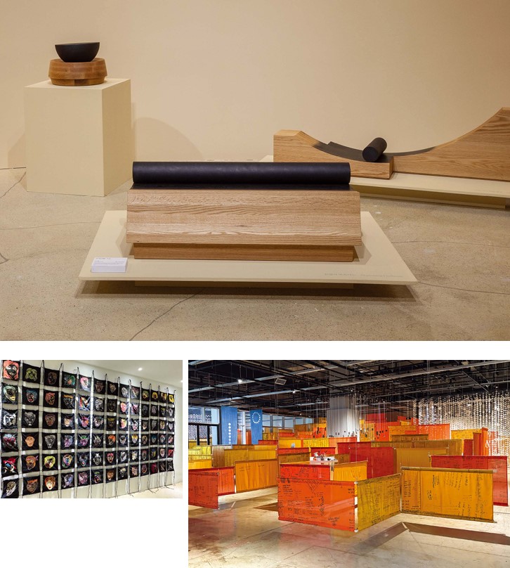 본전시가 공예의 내적 언어를 해부했다면 특별전과 국가관, 국제 공모전은 외부와의 접속으로 지평을 넓혔다. 현대자동차와 협업한〈현대 트랜스로컬 시리즈〉는 그 첫 무대를 청주에서 선보였고, 영국 휘트워스 미술관과 인도 국립공예박물관이 공동 기획한 《엮음과 짜임》은 각 지역의 공예 전통을 리서치와 신작으로 엮어내며 지역적 정체성이 초지역적 네트워크 속에서 다시 짜일 수 있음을 보여준다. 주빈국관 태국전 《유연한 시간 속에서 살아가기》는 상업화와 속도의 압력 속에서도 고유한 공예 문화를 지켜온 태국의 면모를 드러낸다. 윗 핌칸차나퐁의 〈미로(Labyrinth)〉(2025)는 불교 사원에서 실제 의식에 쓰였던 천을 오랜 시간 모아 만든 설치 작업으로, 관람객이 천 사이를 걸으며 명상적 시간을 경험하도록 한다. 국제 공모전에는 역대 최다인 71개국 990명이 참여해 청주가 공예의 글로벌 플랫폼으로 자리매김했음을 확인시켰다. 대상작 이시평의 〈일지(Log)〉(2024)는 목재와 금속, 소리를 결합해 감각을 확장하는 공예의 본질을 압축적으로 보여준다.