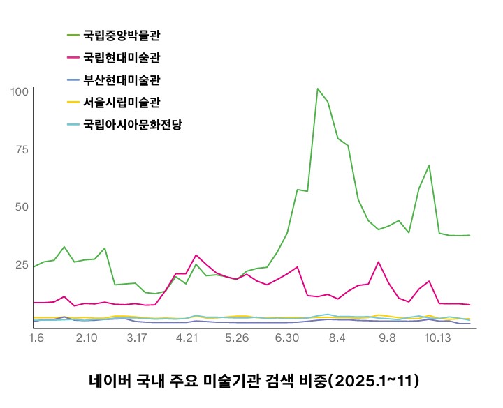 강재영 이번엔 국내 주요 미술 기관 다섯 곳의 검색량을 비교해봤다. 국중박이 검색비중 1위를 유지하는 가운데, 국현은 론 뮤익 개인전이 열렸던 시기 잠시 국중박을 추월하는 모습도 볼 수 있다. 그러나 7월 들어서 국중박에 대한 검색 비중이 최대 4배 정도까지 올라가는데, 이는 〈케데헌〉의 흥행과 뮷즈 재조명, 유홍준 관장 선임 등의 시기가 겹치며 일어난 효과로 보인다. 두 국립기관과 지역 문화기관과의 검색량 차이는 여러 해석의 여지가 있다.
