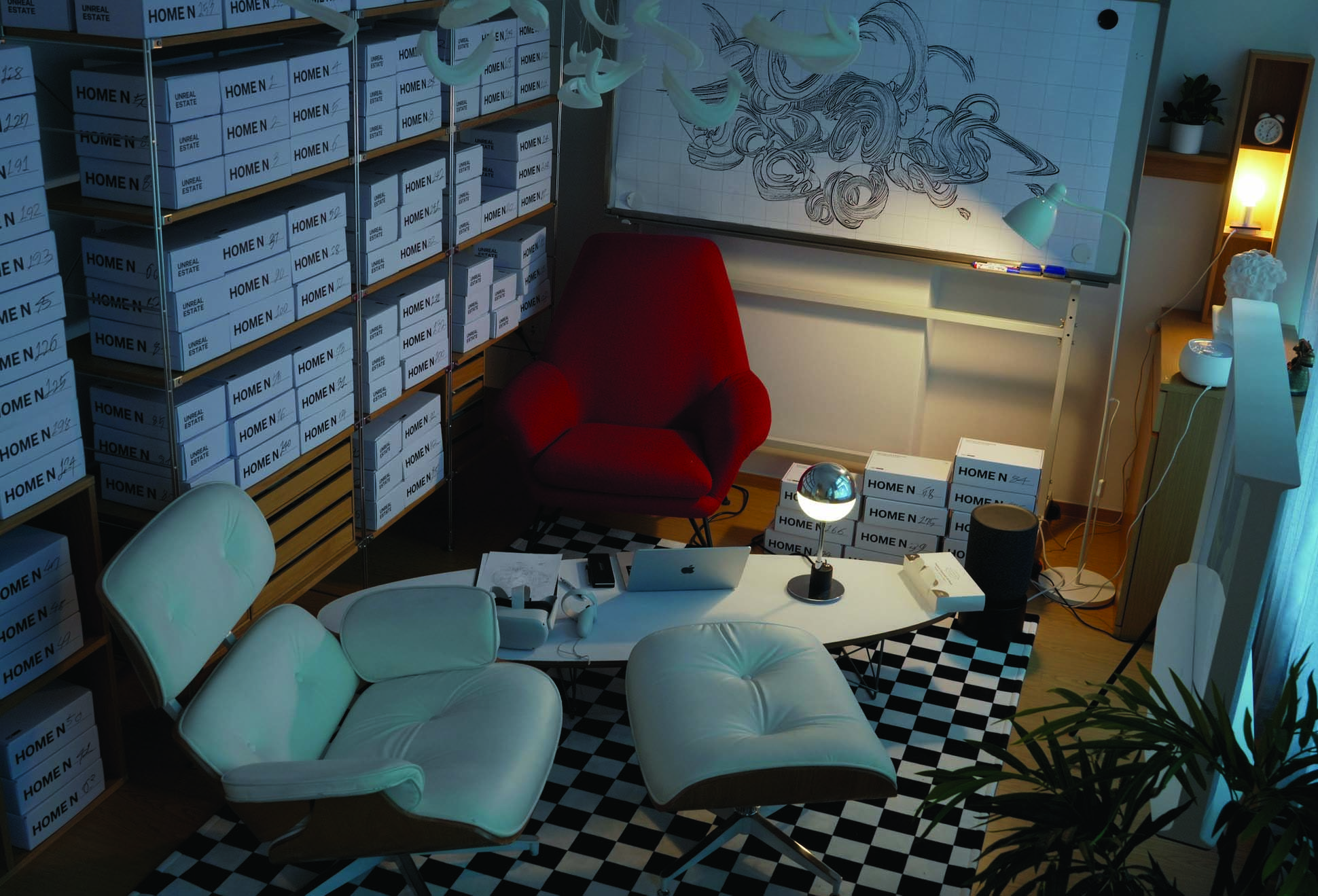 에피소드 신촌에서 선보인 〈언리얼 에스테이트〉 종이 상자, 나무 향, 허브차, 영상, VR, 모빌, 대화, 상담용 소파, 지도 2022