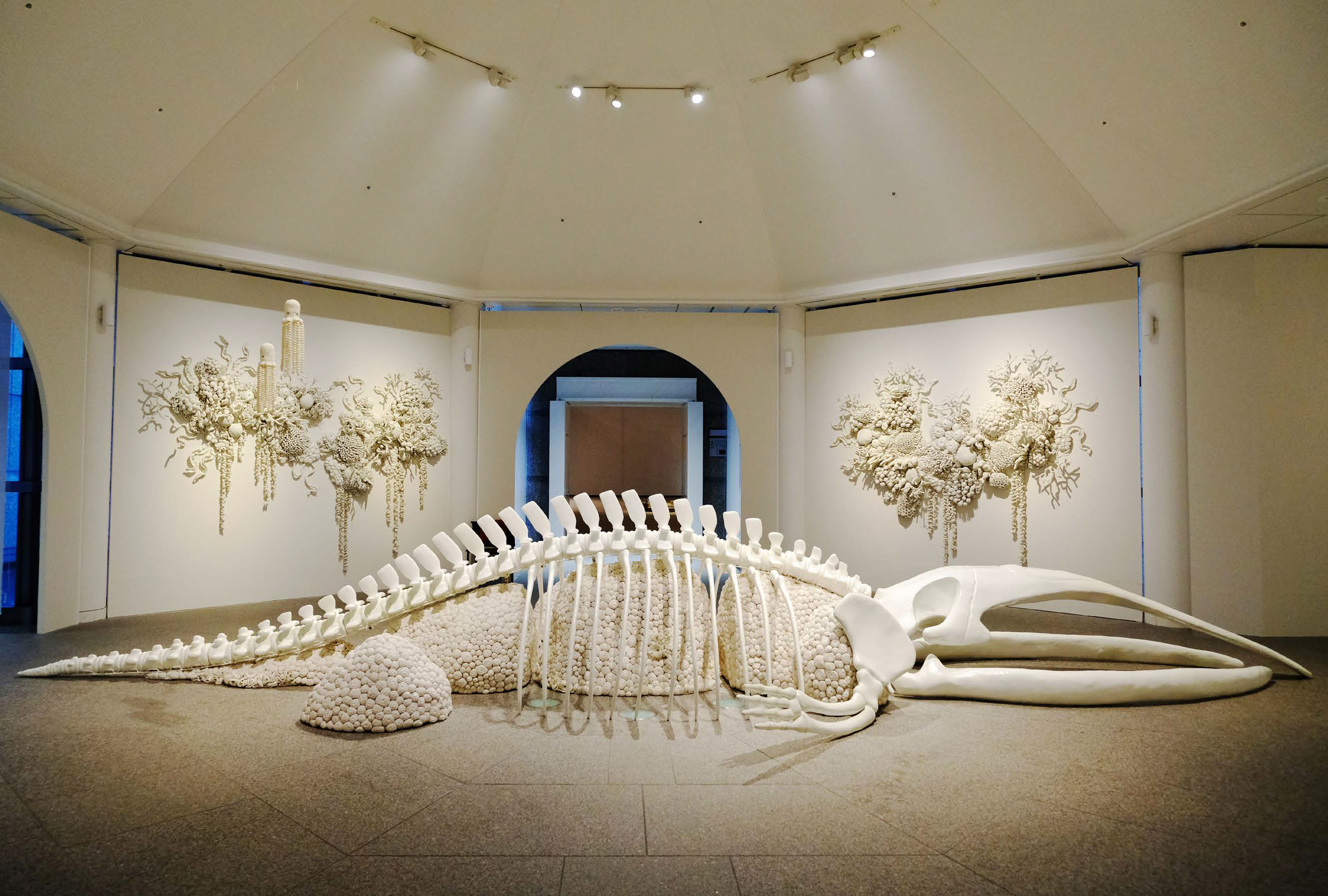 주전시장인 아이치 예술문화센터의 큐레이션은 ‘재’와 ‘장미’를 이분법적으로 나누기보단 그 사이의 유동적인 시간을 탐색하도록 설계되었다. 다소 추상적일 수 있는 전시의 주제를 각 작품이 품은 메시지, 그리고 작품 간의 관계 속에서 세밀하게 엮어냈음을 가이드북에서도 알 수 있었다. 순서 없이 자유롭게 관람해도 좋다는 지침이 있었지만, 자연스레 작품에 매겨진 번호를 따라서 전시를 관람하게 되었다. 처음으로 관객을 맞이하는 작품은 훼손되는 해양 생태계에 대한 경각심을 뜨개질 공예로 시각화하는 작업으로 알려진 인도네시아 작가 물야나(Mulyana)의 〈해류와 꽃피움 사이(Between Current and Blossom)〉(2019~)이다. 화려한 색감의 털실로 뜨개질된 거대한 인공 산호초와 해양 생물이 관객을 맞이했다. 이는 곧 스기모토 히로시의 흑백 사진 연작으로 연결된다. 미국에서 학습용으로 사용하는 동물 디오라마를 장노출 촬영한 그의 작업은 실제 자연과 구분하기 힘들 정도의 현실감을 느끼게 하는데, 이런 위상의 전환은 물야나가 뜨개질로 만든 인공해초의 부드러움과 엮여 인간과 자연의 지난한 착취 관계로부터 인간과 자연의 관계를 뒤집어 생각하게 한다. 이는 바로 다음 공간의 오코지마 마키의 대작 〈내일의 수확〉(2017~2018)을 통해 인간과 비인간이 공존하는 혼종적 미래 사회에 대한 전위적 상상을 뒷받침하며 동시대 대형 미술 전시에서 느끼기 어려운 몰입감까지 만들어낸다.