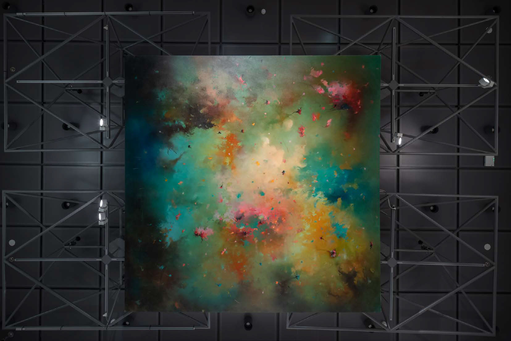 천장과 벽을 둘러싼 이라크 출신 작가 바심 알 샤커(Bassim Al Shaker)의 거대한 회화 작품 〈Sky Revolution〉(2023)은 언뜻 생명의 우주적 순환 따위의 희망찬 발산의 에너지를 표현한 것처럼 보이지만, 실은 2003년 이라크 전쟁 공습 당시 자신이 직접 목격한 폭격 장면을 떠올린것이다. 그에게 공습은 여전히 파괴적인 죽음의 기억이지만, 그는 이 작업이 ‘새로운 시작’이라 말한다. 마치 공습 현장에 있는 듯, 혹은 우주적 환희의 순간에 있는 듯 관람객을 혼란과 경외심에 빠지게 하는 이 공간은 전시 전체에서 주제의식을 가장 선명하고 강하게 드러내며 내러티브를 담은 회화의 힘을 되새기게 한다.