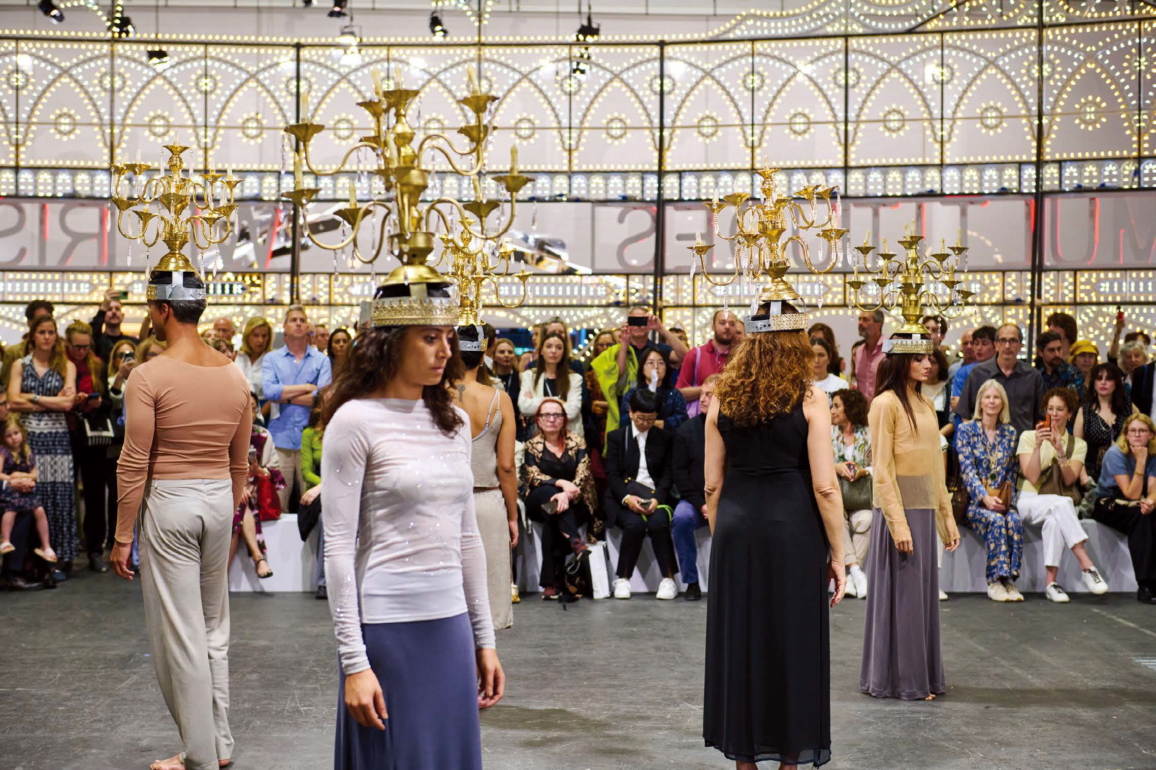 카이로를 기반으로 활동하는 나사포나사의 집단 퍼포먼스는 약 30분간 이어졌다. 매달린 펜던트들이 부딪치며 울리는 맑은 소리가 공간을 가득 메우고, 거대한 머리장식의 무게에 짓눌린 듯한 몸짓이 펼쳐졌다. 이 작업은 누라 세이프 하사닌(Noura Seif Hassanein)과 살마 압델 살람(Salma Abdel Salam)이 2023년에 구상했으며, 결혼식에서 종종 선보이는 전통 이집트 춤인 샤마다(Shamadan)를 보다 사유적인 차원으로 재해석한 것이다