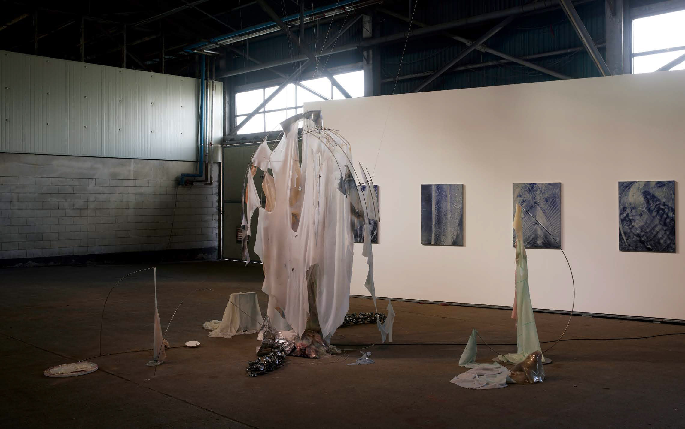Said interest in artificial worlds ultimately paves the way toward the artist’s identity as a creator of things. The accumulation of discarded objects is a far sight from a critique of modern civilization, a Benjaminesque summoning of the past, or a construction of an archive. The artist collects and cobbles together sundry objects one by one because he discovers certain formative points of fascination in what appears to be trash. Jung has always been drawn to concrete things made by hand, finding joy in the process of combining the colors and shapes of different objects. Reconfiguration—where an object (or part of a particular object) is removed from the context of its original use and given a new role—remains a key characteristic which we discover throughout the entirety of Jung’s catalog of work. Rather than create something entirely new, Jung’s method consistently revolves around recycling what already exists to transform what they stand for, or situating already completed objects in different contexts to reveal them in another light altogether. For example, Nobody Knows Where (2012)—an early piece produced during his stay in London—is a boat made from trash that had washed up on the banks of the Thames and was afterward set back adrift on the river. Seven years later, he submitted Infinite Metal (2019) to the Multipurpose Henry (Maison Hermès Dosan Park, 2019) exhibition, creating a geometric beauty of form out of waste materials collected from the construction site of the Platform-L Contemporary Art Center. It is also a common occurrence for Jung to recycle his previous work. The legs that lugged around Night Walker (2013) were transformed into the legs for Rock Book (2018) as part of the One-A-Day (Art Sonje Center, 2018) exhibition and the wooden panels used as performance/installation materials at the 2016 Gwangju Biennale were repurposed to form the pedestal for Caught Sleeve (2023) in the Hangdog (Art Sonje Center, 2023) exhibition. Likewise, structures from previous exhibitions held at the site are often repurposed as materials in Jung’s installation works. In One-A-Day, the Entrance and Floor (2018) piece was sculpturally composed from the carpet of a preceding exhibition, while in Hangdog, the freestanding wall from a prior exhibition entitled Suh Yongsun: My Name Is Red (2023) was reused as a slanted pedestal.